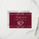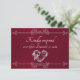 Design features an elegant burgundy background embellished with a delicate silver scroll heart and dividers. Stylish script place holders for the date are on the front, and response information on a white pearl back. Perfect for the simple to most elegant wedding. Also available with different colored backgrounds for your wedding theme colors. Designed to coordinate with the "Romantic Scroll Hearts & Calligraphy" Wedding Collection. To change details, click «Personalize». To move the text or change the text size, font, or color click «Click to customize further»