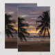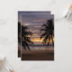 En solnedgång i badande strand med en gyllene och lila himmel, lugn oceanen vinkarare och en svart silhuett från handflatan träd på högerna. De varma nyheterna reflekterar över vatten och skapar en romantisk och serenisk atmosfär - perfekt för en bröllopsinbjudan.