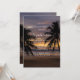 En solnedgång i badande strand med en gyllene och lila himmel, lugn oceanen vinkarare och en svart silhuett från handflatan träd på högerna. De varma nyheterna reflekterar över vatten och skapar en romantisk och serenisk atmosfär - perfekt för en bröllopsinbjudan.