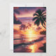En solnedgång i badande strand med en gyllene och lila himmel, lugn oceanen vinkarare och en svart silhuett från handflatan träd på högerna. De varma nyheterna reflekterar över vatten och skapar en romantisk och serenisk atmosfär - perfekt för en bröllopsinbjudan.