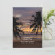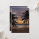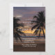 En solnedgång i badande strand med en gyllene och lila himmel, lugn oceanen vinkarare och en svart silhuett från handflatan träd på högerna. De varma nyheterna reflekterar över vatten och skapar en romantisk och serenisk atmosfär - perfekt för en bröllopsinbjudan.