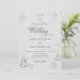 En elegant, modern romantisk, snövit vinterinbjudan till bröllopskort med ett vinterunderlandstema med gräs träd och snöflingor täckt i rinestoner och glitter (detta är digitala effekter, inte verkliga stenar eller glitter!) och en skakande vintervit bakgrund. Parets monogram är omgivna av ömtåligt och eteriskt glitter och rhinestoner snöflingor. Elegant och klass, med sina diskreta rinestoner och sparkler, passar det ett vinterbröllop firande i elegant och en mer avslappnad, romantisk boho bröllop.