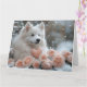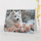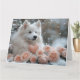 Skicka varma önskningar om Alla hjärtans dag med detta mjuka pastellkort med en bedårande amerikansk eskimo-hund som håller en hjärtformad bukett, omgiven av ömtåliga rosor och rosa peonior. Med försiktigt fallande snöflingor och en drömmig, romantisk vintermiljö i bleka rosa och vita nyanser fångar detta kort den mysiga charmen hos en vinterromans - perfekt för hundälskare och alla som firar kärlek.