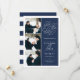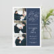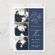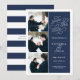 Vårt foto med Romantic Request-förlovningen sparar enkelt och elegant datumkortets tre bilder som är placerade längs den lämnat sidan och dina bröllop-detaljer på högerna i vitt på marinblått. "Spara datumet" visas i vit skripttypografi med ett chicens hjärta inarbetat i designen. Lägg till information om bröllop, inklusive namn, datum och plats för bröllop. Kort som går tillbaka till det moderna vågrät rand i marinen och vitt, med ytterligare fält för din bröllop webbplats eller ytterligare information...