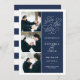 Vårt foto med Romantic Request-förlovningen sparar enkelt och elegant datumkortets tre bilder som är placerade längs den lämnat sidan och dina bröllop-detaljer på högerna i vitt på marinblått. "Spara datumet" visas i vit skripttypografi med ett chicens hjärta inarbetat i designen. Lägg till information om bröllop, inklusive namn, datum och plats för bröllop. Kort som går tillbaka till det moderna vågrät rand i marinen och vitt, med ytterligare fält för din bröllop webbplats eller ytterligare information...