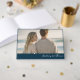 Denna bröllopsgästbokomslag har en lugn strandscen med två individer som står tätt ihop och vänder sig mot havet. Designen använder mjuka, naturliga nyanser av blått och neutrala färger för att skapa en lugnande och romantisk atmosfär. En marinblå rektangel längst ner innehåller elegant kursiv text för anpassning, vilket gör den perfekt för att lägga till namn eller speciella meddelanden. Den övergripande layouten är balanserad och minimalistisk, med tonvikt på intimitet och lugn, perfekt för att fånga kärleksfulla ögonblick på din speciella dag.