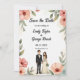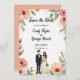 Den här blommigten med elegant vattenfärg sparar datumet inbjudan är perfekt för ett modernt bröllop. Den romantiska designen har en elegant vattenfärgsbild i ram med en blommigt med brud- och groombild och svart kalligrafi på vit bakgrund.