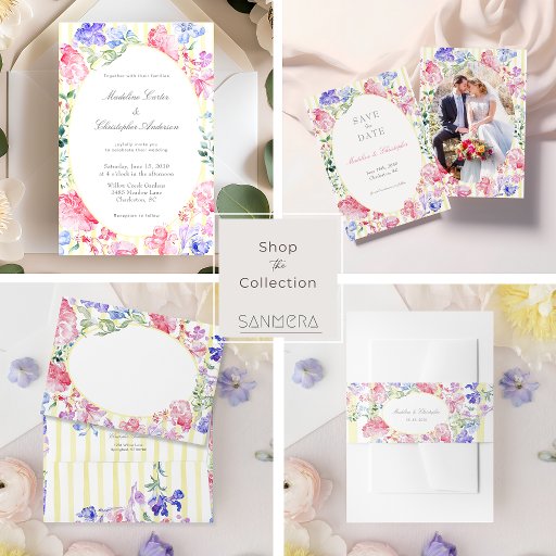 Den här returadressetiketten för blommigten ReEmergency stil bröllop är ett vackert sätt att skicka inbjudan. Utformningen har färgstarka vattenfärgblommor och en snyggt som har en strimlad bakgrund, vilket tyder på en aning av ReEmergency-era elegance, perfekt för en vår- eller sommarblommigt bröllop. Du kan anpassa den här etiketten för ett polerat utseende från bröllop.