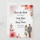 Den här blommigten med elegant vattenfärg sparar datumet inbjudan är perfekt för ett modernt bröllop. Den romantiska designen har en elegant vattenfärgsbild i ram med en blommigt med brud- och groombild och svart kalligrafi på vit bakgrund.