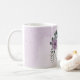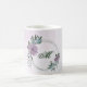 Unik kaffekopp med romantiska dammiga lila och blå blommor och gröna blad.
