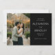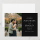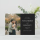 Denna bröllops-"save the date" har en tudelad layout med ett romantiskt fotografi av ett par som kramas framför ett varmt upplyst växthus, vilket skapar en intim och mysig atmosfär. Höger sida visar elegant text på svart bakgrund med sofistikerade serifferade teckensnitt som framhäver evenemangets detaljer. Färgpaletten kombinerar naturliga gröna och bruna toner från växtligheten med varma gula nyanser från ljusslingor, vilket ger en klassisk och tidlös känsla. Perfekt för att sätta tonen för en minnesvärd fest, denna design balanserar visuell charm med tydlig kommunikation, vilket gör den idealisk för par som vill dela sin speciella nyhet med stil.