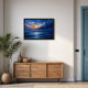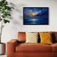 Njut av skönheten i den romantiska solnedgången, med ett dramatiskt sjölandskap med djupt blått vinkart och glödande gyllene solljus. Perfekt för kustdekoration. Den här teckningen ger en känsla av lugn och djup i alla utrymmen. Perfekt för älskare, havsbeundrare och solnedgångsaggregat tittar för elegant väggkonst.