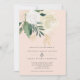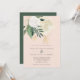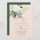 En modern och romantisk bröllopsinbjudan. Den här utformningen har en kaskad av vattenfärgen ro i vitt och elfenben, grönt löv och dammning av faux glitter, i bakgrund. Baksidan är i fast mörk grönt. Den här blandningen av rosa och mörk grönt gör att den här inbjudande perfekten spelar roll vilken säsong din stora dag är planerad till.
