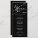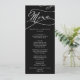 Den här romantiska kalligrafens mörk svarta bröllop-middagsmenykortet är perfekt för ett enkelt bröllop. Den moderna klassiska designen har finare-snurrar och vitaktiga blomningar med en elegant elegant, handskriven typografi. Den här menyn kan användas för bröllopsmottagning, repetitionsmiddag eller vad som helst.