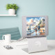 Denna förtrollande kustscen fångar en drömsk solnedgångspromenad längs en gyllene strand, där mjuka vågor kysser sanden och varmt ljus dansar över vattnet. Ett stilfullt par går hand i hand bredvid en fluffig följeslagare, deras silhuetter lyser mot en pastellfärgad himmel med penseldrag av roséfärgade, aprikosfärgade och pudrig blåa moln. I fjärran driver en graciös segelbåt fredfullt, medan ett storslaget kusthus vilar på toppen av en blomsterkantad klippa, omgiven av frodig grönska och blommande trädgårdsgångar. Hela kompositionen känns som en modern cottagestyle-dagdröm, genomfluten av mysig kustcharm och en antydan till bohemisk romantik. Sköra reflektioner skimrar i den våta sanden och skapar en lysande, målerisk estetik som känns både fantastisk och
