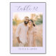 Det här bröllopsbordskortet har en minimalistisk och romantisk design med en mjuk pastellfärgspalett i ljust lavendel och varma beigetoner. Layouten inkluderar ett elegant kursivt skrivstil för "bord 12" högst upp, kompletterat med en stor fyrkantig fototavla i mitten som visar en naturlig utomhusmiljö under solnedgång eller soluppgång. Under fotot visas anpassningsbara namn i ett enkelt sans-serif-teckensnitt, vilket ger designen en personlig touch. Den övergripande stämningen är en av värme och intimitet, vilket gör den perfekt för bröllop eller formella sammankomster.