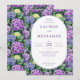 Denna eleganta bröllopsinbjudan har en frodig blomsterdesign med hortensior i nyanser av lila, blå och grön, som skapar en romantisk trädgårdsatmosfär. Den centrala ovala ramen framhäver evenemangets detaljer i en klassisk serif-font, som ger en formell men inbjudande look. Perfekt för par som söker en sofistikerad touch, kombinerar denna design rika färger och detaljerade illustrationer för att sätta tonen för en minnesvärd firande.