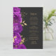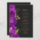 Den här elegantens moderna bröllop-meny har en gräns av lila blommor och guld faux foil löv. Anpassa guld-färgad kursiv text på mörkens svarta bakgrund. Baksidan av menyn är massiv skiffersvart.