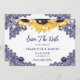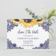 Elegant Stenmarblått kort och bröllop spara datum solroskort med solrosblommor och marin blå blommigt snöre. Blåhjärtan längst bak. Matchningsalternativ som är tillgängliga för att komplettera det här romantiska blåa bröllop spara datum-kortet för marinen.