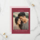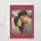 Denna bröllops-karta för att spara datumet har ett varmt, intimt fotografi av två individer i en tillgiven pose, inramad av en solid vinröd ram. Designen använder en minimalistisk layout med ren, sans-serif-typografi som framhäver anpassningsbara element för namn och datum. Färgpaletten inkluderar jordnära toner från fotot, kompletterat med den rika vinröda ramen, vilket skapar en mysig och elegant estetik. Perfekt för att förmedla kärlek och förväntan, är detta kort idealiskt för par som vill skapa en romantisk ton för sin kommande fest.