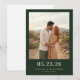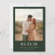 Denna bröllops-karta "spara-datum" har en romantisk utomhusscen med två individer som kramar om varandra i en ökenmiljö, infattad av en mörkgrön ram. Designen använder varma jordtoner och mjuk belysning för att skapa en intim atmosfär, förstärkt med elegant serif-typografi för datum och namn, tillsammans med en enkel sans-serif-teckensnitt för platsen. Perfekt för att sätta tonen för en speciell tillställning, kombinerar detta kort fotografisk realism med stilfulla textelement för att förmedla kärlek och förväntan.