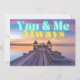 Romantiskt och modernt kort är ett foto av tropiska båtdockor vid solnedgång med texten "Du och mig alltid" i Neon aqua och guld. Anpassadet "Lycklig-årsdag" på baksidan