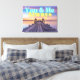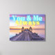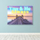 Romantiskt och modernt kanvastryck har fotografi av tropiska öbåtdockor vid solnedgång med texten "Du och mig alltid" i neon aqua och guld.