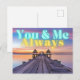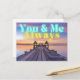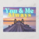 Romantisk och modern vykortdesign med fotografi av tropisk ö båtdocka vid solnedgång med neon akvafärg och guldtext som lyder "Du och jag alltid"