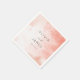 Denna bröllopsserviettdesign har en mjuk akvarellbakgrund i bleka rosa och vita nyanser, vilket skapar en eterisk, molnliknande effekt. Layouten är centrerad med elegant typografi, som kombinerar rena sans-serif-teckensnitt för namnen och ett delikat kursivt skrivsätt för "och", vilket förstärker dess romantiska charm. Den minimalistiska stilen betonar enkelhet och klarhet, vilket gör den perfekt för intima firanden. Dess lugna stämning och milda färgpalett frammanar en tidlös och drömlik atmosfär, idealisk för speciella tillfällen som bröllop.
