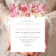 Den här romantiska bröllopsinbjudan för blommigt har en rosa och guld blommigt överst i gräns. Parets namn visas i klassiskt serif-teckensnitt, med den återstående texten i sans serif, på vit rosa. Kortets baksida är en samordnande skugga av fast rosa.