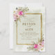 Elegant och romantik: Den här blommigtens bröllopsinbjudan har en som spolar vattenfärgen i skuggor av rosa, och grädde, accentuerad med grön färg och framtagen av ett bekymrat guld-geometriskt gräns. Med en mjuk vattenfärg tvättar du bakgrunden, designen exuderar tidlös charm och sofistikering - perfekt för trädgårdsbröllop, rustik firande eller romantiska semesterceremonier. Den här inbjudan blandar modern typografi med lite vintage, skapar den ett oförglömligt första intryck för din stora dag.