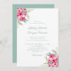 Romantiska blommigtar i rosa, teal och kräm-blommar i hörnen av blommigtens bröllopsinbjudan, med delikat tealtext. Baksidan visas i en fast blå grönt färg, som kan bytas ut mot kostym.