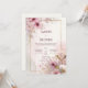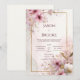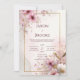 Meddela din bröllopsdag med den drömlika, romantiska elegansen hos denna rosa blomsterbröllopsinbjudan. Designen är byggd på en mjuk, eterisk bakgrund med flytande akvarelltvättar i blekt rosa och subtila grågröna nyanser, som påminner om delikat marmor eller blommande bläck. En slank, kontinuerlig falsk guld rektangulär ram sitter centralt och ger en lyxig, förfinad ram för din text. Denna ram är rikligt utsmyckad med akvarellblommor, med livfulla djuprosa och mjuka ljusröda blommor (som körsbärsblommor eller vallmo) med ömtåliga ståndare. Luftiga guldblomsterkvistar och glittrande guldstoft strömmar in i ramen från hörnen och förstärker den eleganta och skimrande kvaliteten hos verket. Den övergripande stilen är romantisk, överdådig och eterisk, perfekt för par som planerar ett vackert vårträdgårdsbröllop, en sofistikerad kvällsmottagning eller någon annan tillställning som betonar mjuka färger, ljus och naturlig elegans. Denna design är