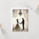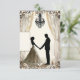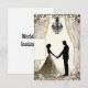 Romantisk silhuett av ett par som håller varandra i handen, placerade i mitten. Kvinnan är iklädd en elegant klänning med invecklade mönster, medan mannen är klädd i en formell kostym. De ramas in av en vacker fond av böljande gardiner, som antyder en atmosfär av intimitet och firande. Ovanför dem hänger en utsirad ljuskrona som ger scenen en touch av elegans. Den övergripande designen är kantad med dekorativa blommotiv, vilket förstärker dess romantiska och sofistikerade känsla. Ett tomt område längst ner möjliggör personliga meddelanden eller inbjudningar.