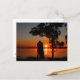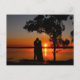 Romantiskt solnedgång, eller soluppgång, silhuett av ett par som delar en kyss från vatten kant-postkortet för alla älskande tillfälle