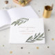 Elegant akvarell botanisk bröllopsgästbok med vackra handritade olivgrenar som ramar in dina detaljer. Personifiera med era namn och bröllopsdatum i naturfärgad typografi.