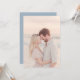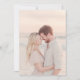 Denna bröllopsinbjudan visar en romantisk strandscen vid solnedgång och fångar ett intimt ögonblick mellan två individer. Designen visar upp varma persiko- och rosa nyanser i kläderna, kontrasterade mot de svala blåa färgerna i havet och himlen, vilket skapar en lugn och harmonisk atmosfär. Den fotografiska realismen framhäver äkta uttryck och känslor, medan den mjuka fokusen på bakgrunden betonar den ömma förbindelsen mellan figurerna. Perfekt för par som söker en drömlik, lugn estetik för att fira sin speciella dag.