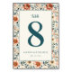 Det här bröllopsbordskortet har en romantisk blomsterkant i nyanser av persika, kräm och dovt grön, vilket skapar en elegant och lekfull ram. Den centrala designen inkluderar en djärv teal siffran "8" med ordet "bord" ovanför i delikat skrivstil, mot en ren bakgrund för en sofistikerad look. Anpassningsbara textfält möjliggör personalisering med namn och datum, vilket gör det perfekt för att lägga till en personlig touch på din speciella dag. Kombinationen av klassisk typografi och lekfulla blommor inger värme och firande, perfekt för att förstärka stämningen på er bröllopsfest.