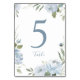 Romantisk trädgårdsdamm, blå blommigt bröllop bordsnummer