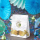 Livlig, romantisk, fantasifull chic fiesta med glänsande grön lövverk och en Palm Springs-vibbar med lekfull vit silke och två bröllopsringar