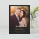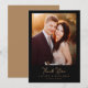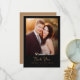 Det här bröllopstack-kortet har en varm och romantisk design med ett centralt fotografi av två individer som står tätt ihop, inramat av en svart kant. Färgpaletten omfattar gyllene solljus och mjuka jordnära toner som skapar en intim atmosfär. Elegant kursiv stil används för "Tack" -meddelandet, medan ett enkelt seriff-skrift ger platsinformation, vilket ger en sofistikerad men hjärtlig estetik. Perfekt för att uttrycka tacksamhet efter en speciell tillställning, kombinerar detta kort fotografisk realism med stilfull typografi för att fira kärlek och uppskattning.
