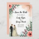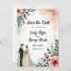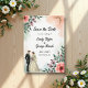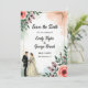 Den här blommigten med elegant vattenfärg sparar datumet inbjudan är perfekt för ett modernt bröllop. Den romantiska designen har en elegant vattenfärgsbild i ram med en blommigt med brud- och groombild och svart kalligrafi på vit bakgrund.