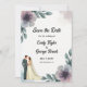 Den här blommigten med elegant vattenfärg sparar datumet inbjudan är perfekt för ett modernt bröllop. Den romantiska designen har en elegant vattenfärgsbild i ram med en blommigt med brud- och groombild och svart kalligrafi på vit bakgrund.