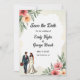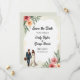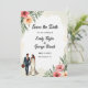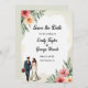 Den här blommigten med elegant vattenfärg sparar datumet inbjudan är perfekt för ett modernt bröllop. Den romantiska designen har en elegant vattenfärgsbild i ram med en blommigt med brud- och groombild och svart kalligrafi på vit bakgrund.