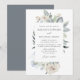 Ange tonen för din speciella dag genom att bjuda in frågor med våra inbjudningar till Blommigten för romska vattenfärger. Den elegant blommigtens bröllopsinbjudan visningar dina uppgifter om bröllop som är inramade av vattenfärgade vita blommor, grönt och skiffer grått/ljusblå blad. De vackra bröllopsinbjudningarna går tillbaka till en solid skifferbakgrund grått.