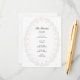 Vi presenterar vårt eleganta bröllopstidsföljdkuvertkort, prytt med en fantastisk oval spetsramillustration i en subtil nyans av antikt vitt och klassisk kalligrafi.