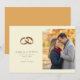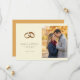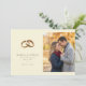 Denna bröllopsinbjudan med spara-datumet har en delad layout med eleganta gyllene bröllopsringar på ena sidan och ett mysigt höstfoto av ett par som kramas på den andra. Designen använder en mjuk jordnära färgpalett, inklusive beige, guld, brunt och dämpade gröna toner, som skapar en varm och romantisk atmosfär. Typografin är ren och klassisk, vilket förstärker det övergripande temat tidlös elegans. Perfekt för par som vill skapa en öm och intim ton för sitt kommande bröllop, kombinerar denna mall modern minimalism med hjärtlig bildspråk.