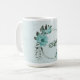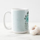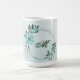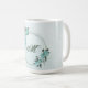 Unik kaffekopp med romantiska blå blommor och vackra gröna blad.