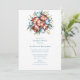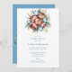 En vackert illustrerad blombukett. Buketen består av stora, vibrerande peonier i terracotta och blå nyanser, kompletterade med mindre blå tulpaner. Det finns också grönt löv och gyllene accenter, som möjligen representerar stammar eller andra blommigt inslag. Blommorna är centralt placerade, och ett par av sammanflätat guldringar är placerat mitt i dem. Hela sammansättningen ställs in mot en vit bakgrund, med tonvikt på färg och detaljer om blommorna.