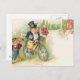 Bedårande vintageillustration av en gris i topp hatt som cyklar och bär en bukett blommor till sin flickvän som tittar över en mur och håller en snygg solfjäder